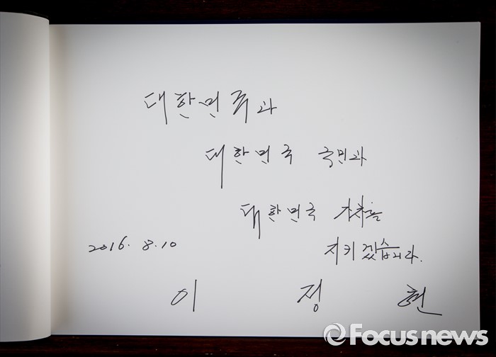 (서울=포커스뉴스) 8·9 전당대회에서 새누리당 대표로 선출된 이정현 대표가 10일 오전 서울 동작구 국립현충원을 찾아 참배 후 작성한 방명록에 '대한민국과 대한민국 국민과 대한민국 가치를 지키겠습니다' 라는 글이 적혀 있다.
