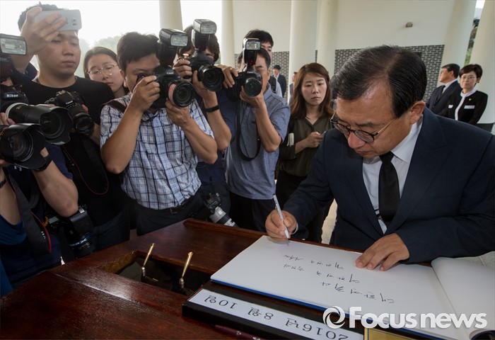 (서울=포커스뉴스) 8·9 전당대회에서 새누리당 대표로 선출된 이정현 대표가 10일 오전 서울 동작구 국립현충원을 찾아 참배 후 방명록을 작성하고 있다.