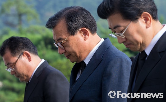 (서울=포커스뉴스) 8·9 전당대회에서 새누리당 대표로 선출된 이정현(가운데) 대표가 10일 오전 서울 동작구 국립현충원을 찾아 참배하고 있다.