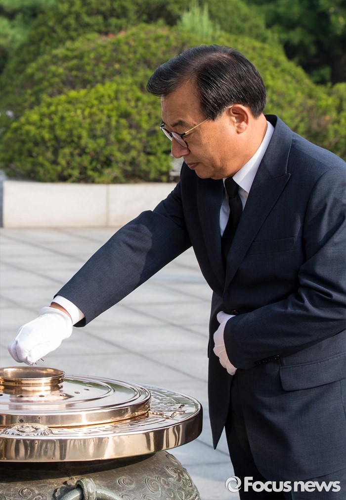 (서울=포커스뉴스) 8·9 전당대회에서 새누리당 대표로 선출된 이정현 대표가 10일 오전 서울 동작구 국립현충원에서 분향하고 있다.