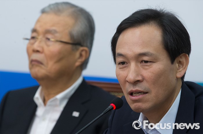 (서울=포커스뉴스) 10일 오전 서울 여의도 국회에서 열린 더불어민주당 비상대책위원회의에 참석한 우상호 원내대표가 발언을 하고 있다. 왼쪽은 김종인 비대위 대표.