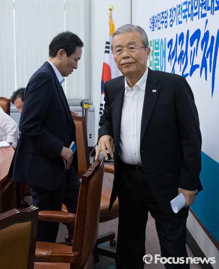 (서울=포커스뉴스) 10일 오전 서울 여의도 국회에서 더불어민주당 비상대책위원회의를 마친 김종인(오른쪽) 비대위 대표, 우상호 원내대표가 퇴장하고 있다.