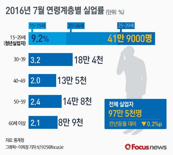 (서울=포커스뉴스) 통계청이 10일 발표한 '7월 고용동향'에 따르면 7월 청년(15∼29세)실업률은 9.2%로 전년동월대비 0.2%포인트 감소했다.