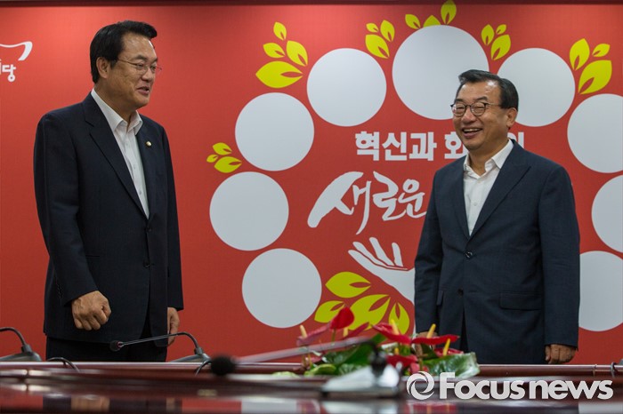 (서울=포커스뉴스) 이정현(오른쪽) 새누리당 대표와 정진석 원내대표가 10일 오전 서울 여의도 새누리당사에서 열린 최고위원회의에 참석해 대화 하고 있다.
