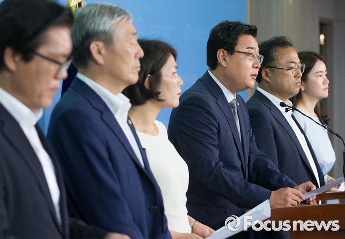 (서울=포커스뉴스) 새누리당 초선 의원들이 10일 오전 서울 여의도 국회 정론관에서 더불어민주당 초선 의원들의 방중 관련 기자회견을 하고 있다. 왼쪽부터 송석준, 조훈현, 전희경, 김성원, 권석창, 신보라 의원.