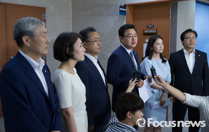 (서울=포커스뉴스) 새누리당 초선 의원들이 10일 오전 서울 여의도 국회 정론관에서 더불어민주당 초선 의원들의 방중 관련 기자회견을 마친 뒤 취재진 질문에 답하고 있다. 왼쪽부터 조훈현, 전희경, 권석창, 김성원, 신보라, 송석준 의원.