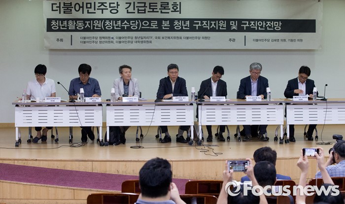 (서울=포커스뉴스) 10일 오전 서울 여의도 국회 의원회관에서 열린 더불어민주당 청년지원사업(청년수당)으로 본 청년 구직지원 및 구직안전망 긴급토론회에 참석한 이병훈(왼쪽 네번째) 중앙대 교수가 발언하고 있다.
