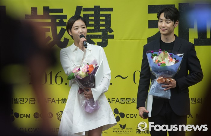(서울=포커스뉴스) 10일 오전 서울 중구 프레스센터에서 열린 '한국영화아카데미 장편과정 10주년 카파 십세전' 홍보대사에 위촉된 배우 김고은(왼쪽)이 소감을 밝히고 있다.