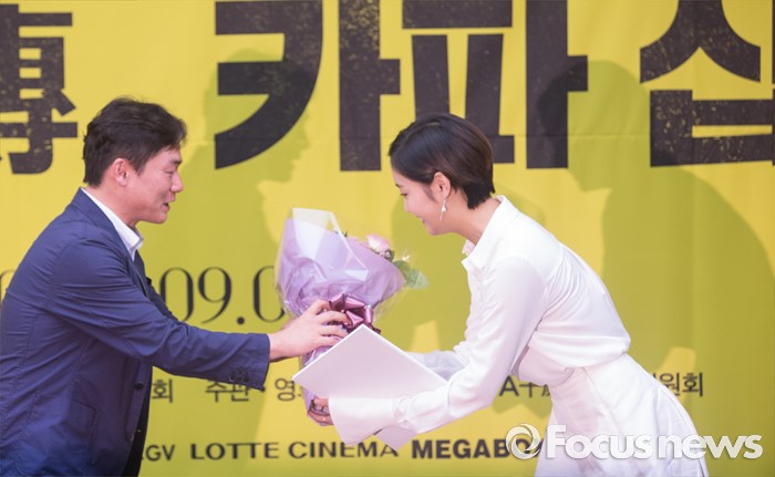 (서울=포커스뉴스) 10일 오전 서울 중구 프레스센터에서 열린 '한국영화아카데미 장편과정 10주년 카파 십세전' 홍보대사 위촉식에 참석한 배우 김고은(오른쪽)이 김이다 집행위원장에게 꽃다발을 받고 있다.