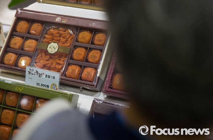 (서울=포커스뉴스) 10일 오후 서울 강남구 코엑스에서 열린 '2016 한가위 명절선물상품전'을 찾은 한 시민이 곶감선물세트를 바라보고 있다.