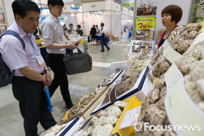 (서울=포커스뉴스) 10일 오후 서울 강남구 코엑스에서 열린 '2016 한가위 명절선물상품전'을 찾은 시민들이 버섯선물세트를 바라보고 있다.