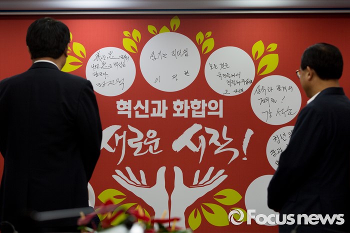 (서울=포커스뉴스) 이정현(오른쪽) 새누리당 대표와 정진석 원내대표가 10일 오전 서울 여의도 새누리당사에서 열린 최고위원회의에 참석해 혁신과 화합의 나무에 서명을 마친 뒤 바라보고 있다.