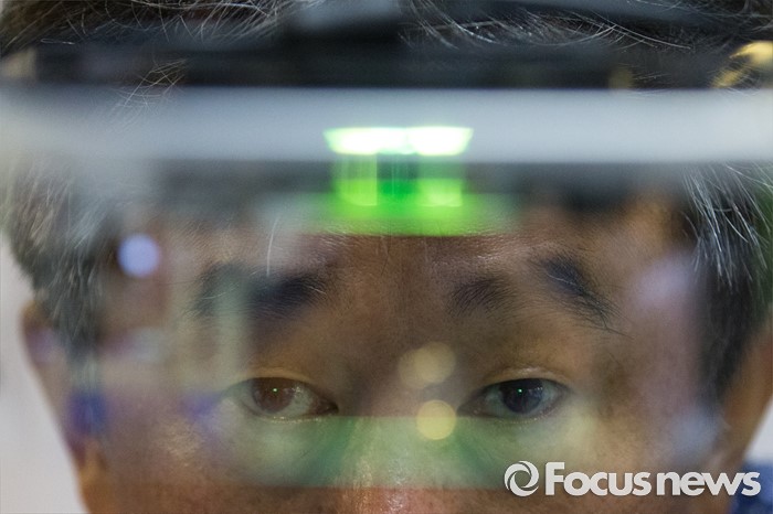 (서울=포커스뉴스) 10일 오후 서울 강남구 코엑스에서 열린 '2016 오토모티브 테크놀로지 엑스포'을 찾은 한 관람객이 헤드업 디스플레이(HUD)를 바라보고 있다.