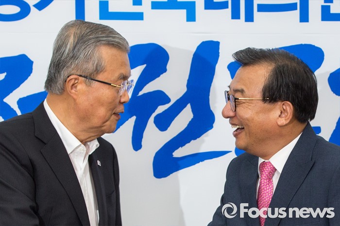 (서울=포커스뉴스) 김종인(왼쪽) 더불어민주당 비상대책위 대표와 이정현 새누리당 대표가 10일 오후 서울 여의도 국회에서 면담에 앞서 인사하고 있다.