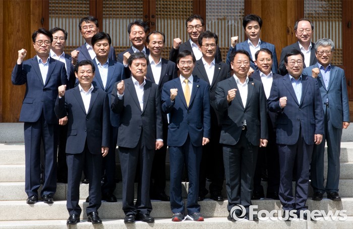 (서울=포커스뉴스) 10일 오후 서울 여의도 국회 사랑재에서 열린 지역경제 활성화를 위한 규제프리존 특별법 왜 필요한가? 간담회에 앞서 조경태 기획재정위원장과 유일호 경제부총리 겸 기획재정부 장관, 허남식 지역발전위원장, 최문순 강원도지사, 이시종 충북도지사, 서병수 부산시장, 윤장현 광주시장, 이춘희 세종시장 등이 기념촬영을 하고 있다.