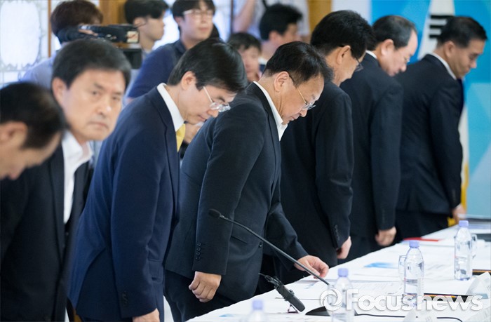(서울=포커스뉴스) 10일 오후 서울 여의도 국회 사랑재에서 열린 지역경제 활성화를 위한 규제프리존 특별법 왜 필요한가? 간담회에 참석한 유일호 경제부총리 겸 기획재정부 장관, 조경태 기획재정위원장, 허남식 지역발전위원장 등이 국기에 대한 경례 후 자리에 앉고 있다.