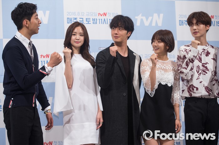 (서울=포커스뉴스) 10일 오후 서울 강남구 임피리얼 팰리스호텔에서 열린 tvN 금토드라마 '신데렐라와 네 명의 기사' 제작발표회에 참석한 배우 이정신(왼쪽부터), 손나은, 정일우, 박소담, 안재현이 포토타임을 갖고 있다.