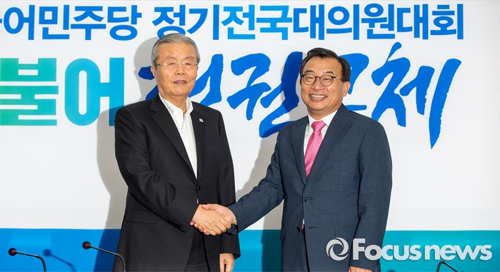 (서울=포커스뉴스) 김종인(왼쪽) 더불어민주당 비상대책위 대표와 이정현 새누리당 대표가 10일 오후 서울 여의도 국회에서 면담에 앞서 악수하고 있다.