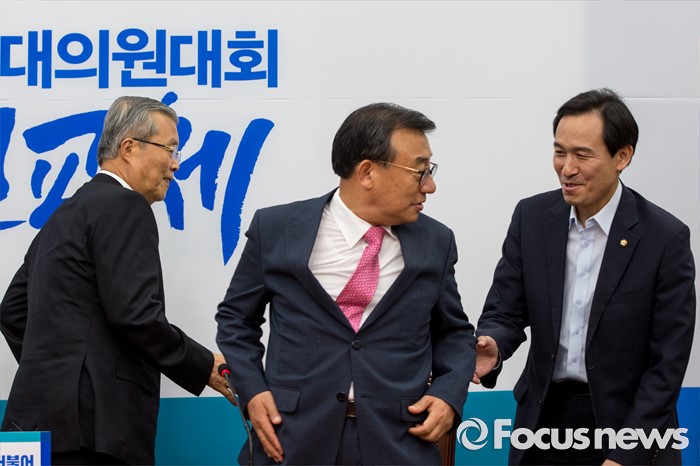 (서울=포커스뉴스) 우상호(오른쪽) 더불어민주당 원내대표가 10일 오후 서울 여의도 국회에서 김종인(왼쪽) 더불어민주당 비상대책위 대표를 예방한 이정현 새누리당 대표와 대화 하고 있다.