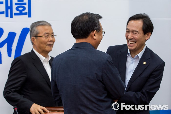 (서울=포커스뉴스) 우상호(오른쪽) 더불어민주당 원내대표가 10일 오후 서울 여의도 국회에서 김종인(왼쪽) 더불어민주당 비상대책위 대표를 예방한 이정현 새누리당 대표와 대화 하고 있다.