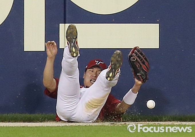 | △ 타구잡다 뒤로 넘어지는 KIA 좌익수 김주찬 |