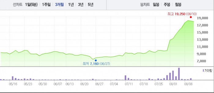 홈캐스트는 7월29일부터 이달 9일까지 1~29%의 상승폭을 나타냈다. 이는 1달 전 주가인 7월11일(9330원)과 비교했을 때 92.92% 상승한 수치다.