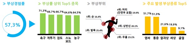 문화체육관광부는 만 19세 이상 1만3397명을 대상으로 실시한 '2015 스포츠안전사고 실태조사' 결과 비정기적 체육활동까지 포함한 생활체육 참여자 중 57.3%가 부상을 경험했다고 밝혔다.