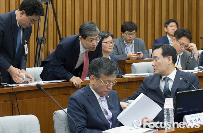 (서울=포커스뉴스) 11일 오전 서울 여의도 국회에서 열린 민생경제 특별위원회 전체회의에 참석한 김현웅(오른쪽) 법무부 장관이 관계자들과 대화하고 있다.