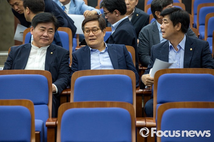 (서울=포커스뉴스) 사드배치에 반발하는 중국 측 입장을 듣기 위해 중국을 방문하고 돌아온 소병훈(왼쪽부터) 더불어민주당 의원, 신동근 의원, 김병우 의원이 11일 오전 서울 여의도 국회에서 열린 의원총회에 참석해 총회 시작을 기다리고 있다.