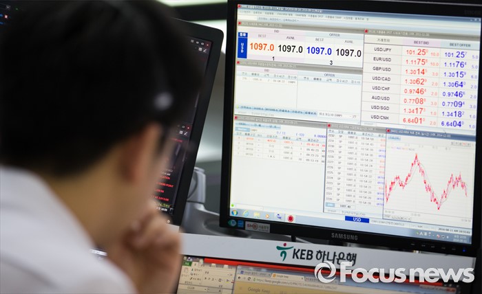 (서울=포커스뉴스) 11일 오전 서울 중구 KEB 하나은행 딜링룸에서 한 딜러가 업무를 보고 있다.