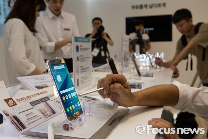 (서울=포커스뉴스) 11일 오전 서울 서초구 삼성전자 사옥에서 열린 '갤럭시 노트7 출시 미디어 행사'에 참석자들이 제품을 체험하고 있다.