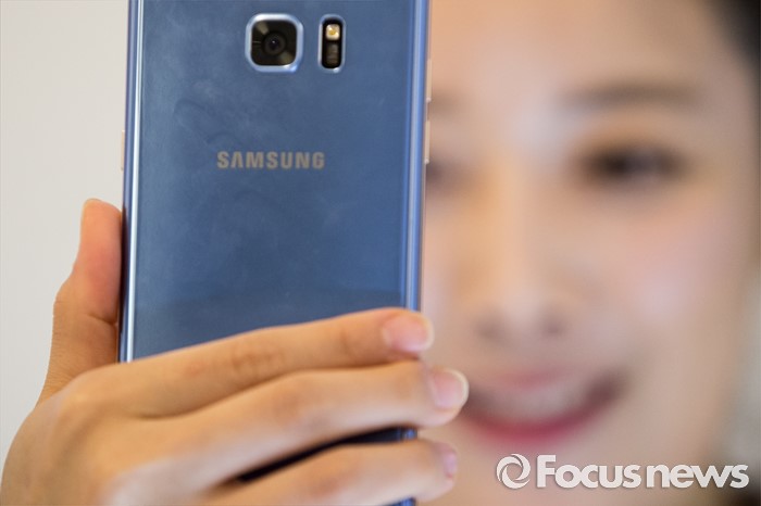 (서울=포커스뉴스) 11일 오전 서울 서초구 삼성전자 사옥에서 열린 '갤럭시 노트7 출시 미디어 행사'에서 관계자들이 홍채 인식 기능을 선보이고 있다.