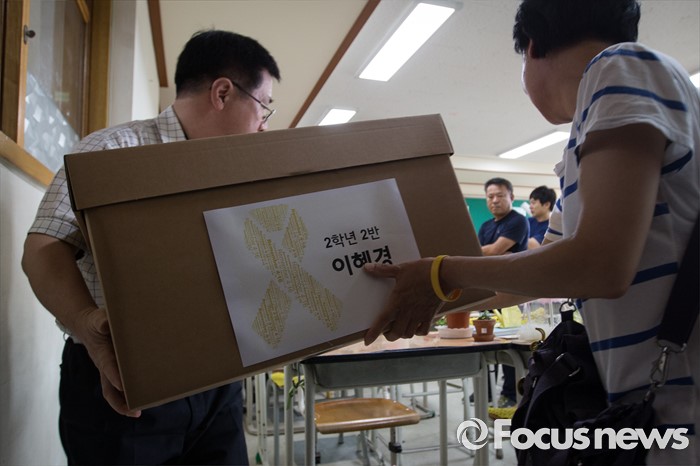 (안산=포커스뉴스) 세월호 참사에서 희생된 단원고등학교 학생들의 교실 이전 절차가 진행 중인 11일 오전, 경기도 안산시 단원고등학교 기억교실에서 희생 아이들 가족들이 책상 정리를 하며 슬픔에 젖어 있다.