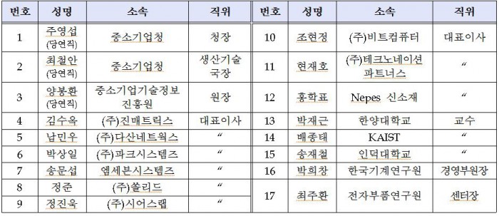 위원은 중기청장, 중기청 생산기술국장, 중소기업기술정보진흥원장 등 당연직 3명과 산업계 9명, 학계 3명, 연구계 2명 등 민간위원 14명 등 총 17명이다. 중기청은 현장에서 통하는 정책 자문을 위해 산업계 위원을 중심으로 구성했다고 설명했다.