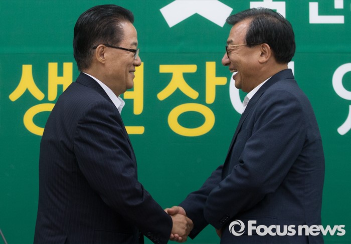(서울=포커스뉴스) 11일 오후 서울 여의도 국회에서 박지원(왼쪽) 국민의당 비상대책위원장이 이정현 새누리당 대표와의 면담에 앞서 인사하고 있다.