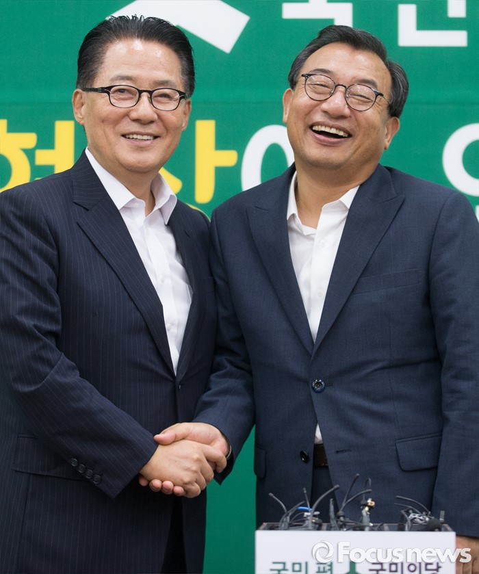 (서울=포커스뉴스) 11일 오후 서울 여의도 국회에서 박지원(왼쪽) 국민의당 비상대책위원장이 이정현 새누리당 대표와의 면담에 앞서 인사하고 있다.
