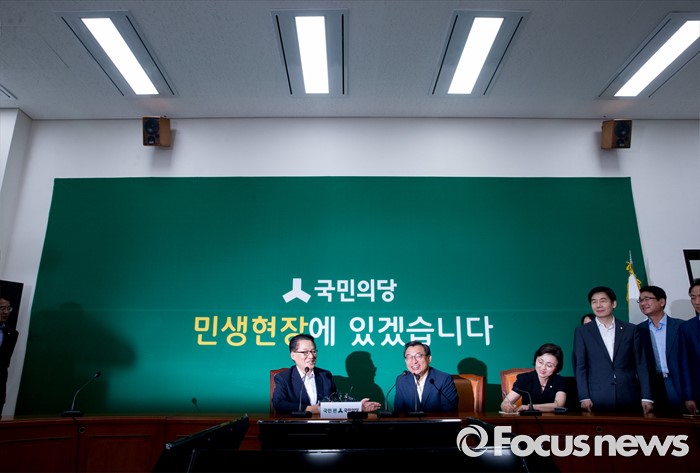 (서울=포커스뉴스) 11일 오후 서울 여의도 국회에서 박지원(왼쪽) 국민의당 비상대책위원장이 이정현(가운데) 새누리당 대표와의 면담을 하고 있다.