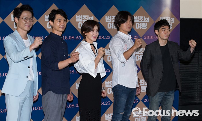 (서울=포커스뉴스) 11일 오후 서울 성동구 CGV 왕십리에서 열린 영화 '범죄의 여왕' 언론시사회에 참석한 출연 배우들이 파이팅을 외치고 있다. 왼쪽부터 배우 허정도, 김대현, 박지영, 조복래, 백수장.