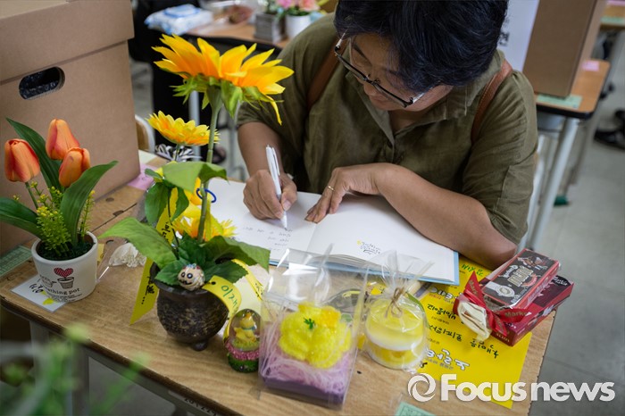 (안산=포커스뉴스) 세월호 참사에서 희생된 단원고등학교 학생들의 교실 이전 절차가 진행 중인 11일 오전, 경기도 안산시 단원고등학교 기억교실에서 한 희생자 아이의 어머니가 단원고 교실에서의 마지막 인사말을 남기고 있다.