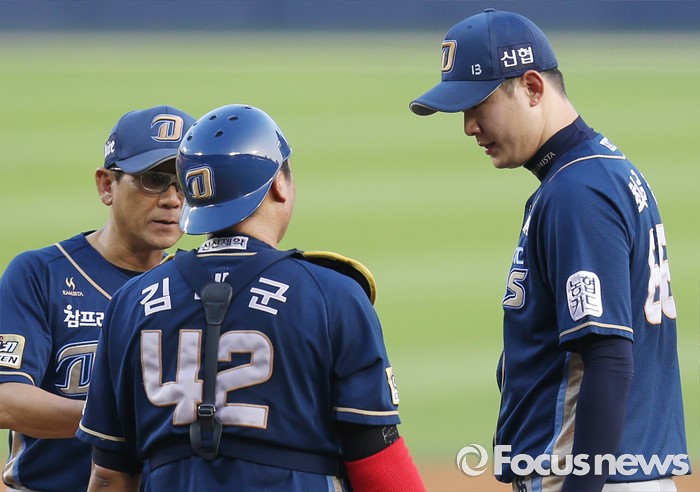 (서울=포커스뉴스) 11일 서울 잠실구장에서 열린 2016 프로야구 NC-LG 경기 2회말 NC 최일언 코치와 포수 김태군이 마운드에 올라가 홈런 포함 연속안타를 맞고 흔들리는 투수 최금강을 안정시키고 있다.