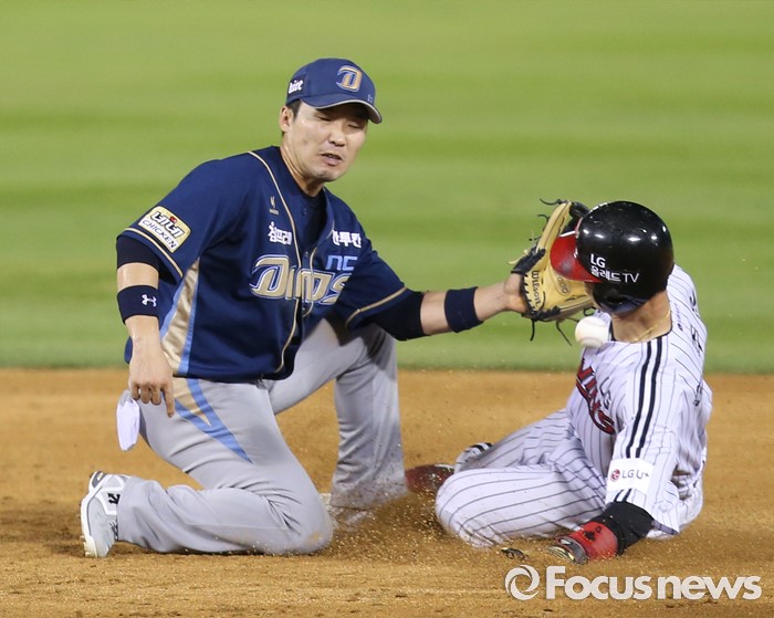 (서울=포커스뉴스) 11일 서울 잠실구장에서 열린 2016 프로야구 NC-LG 경기 4회말 1사 1,3루에서 LG 1루주자 손주인이 2루 도루를 시도해 슬라이딩하며 NC 유격수 지석훈의 글러브에 얼굴을 부딪히고 있다.
