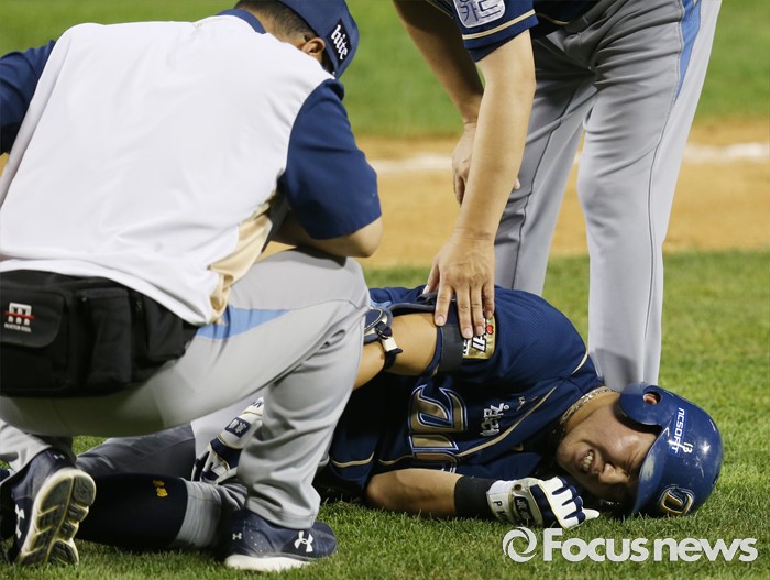 (서울=포커스뉴스) 11일 서울 잠실구장에서 열린 2016 프로야구 NC-LG 경기 9회초 무사 1루에서 NC 박민우가 LG 임정우의 투구에 맞아 고통스러워하며 트레이너의 치료를 받고 있다.
