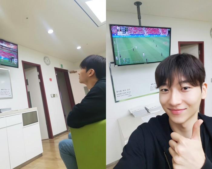공개된 사진에는 민찬기가 드라마 촬영 대기실에서 올림픽 경기를 시청하고 있는 모습과 함께 엄지를 들어보이는 포즈를 취한 모습이 담겼다.